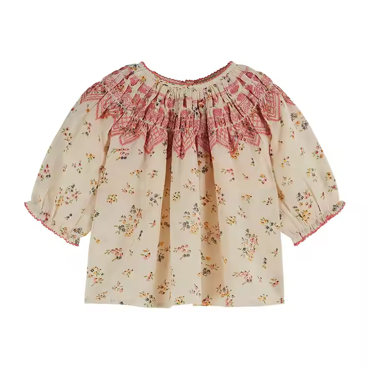 Hot Tags : Vintage Linen Baby Blouses Embroidered Pleated Kids Tops Three-quarter Sleeve Girl Shirts