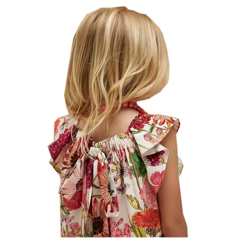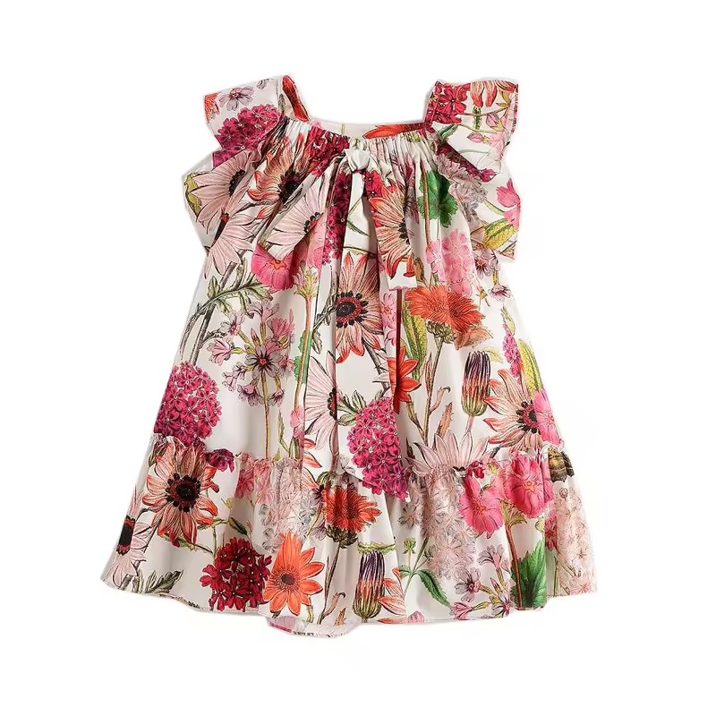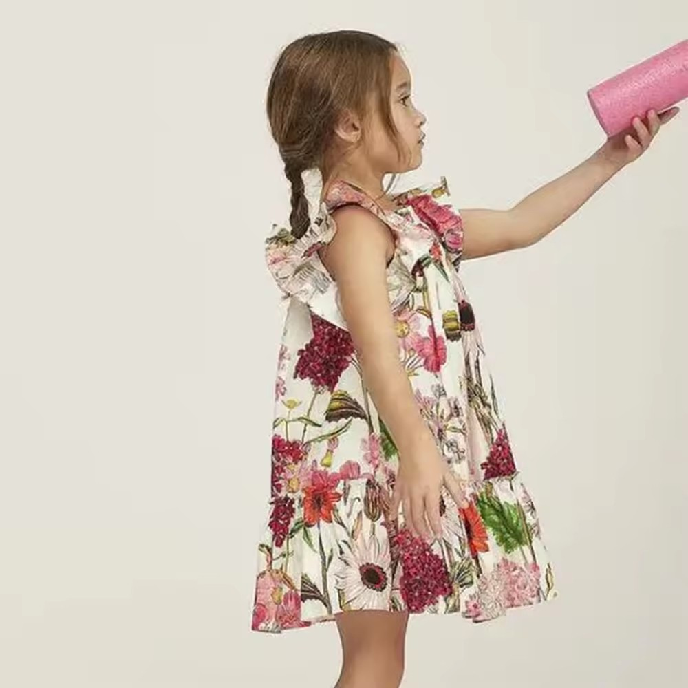 Custom High Quality Kids Dress Pinafore Style Sleeveless Ruffles Floral Pattern Printing Baby Girl's Dresses