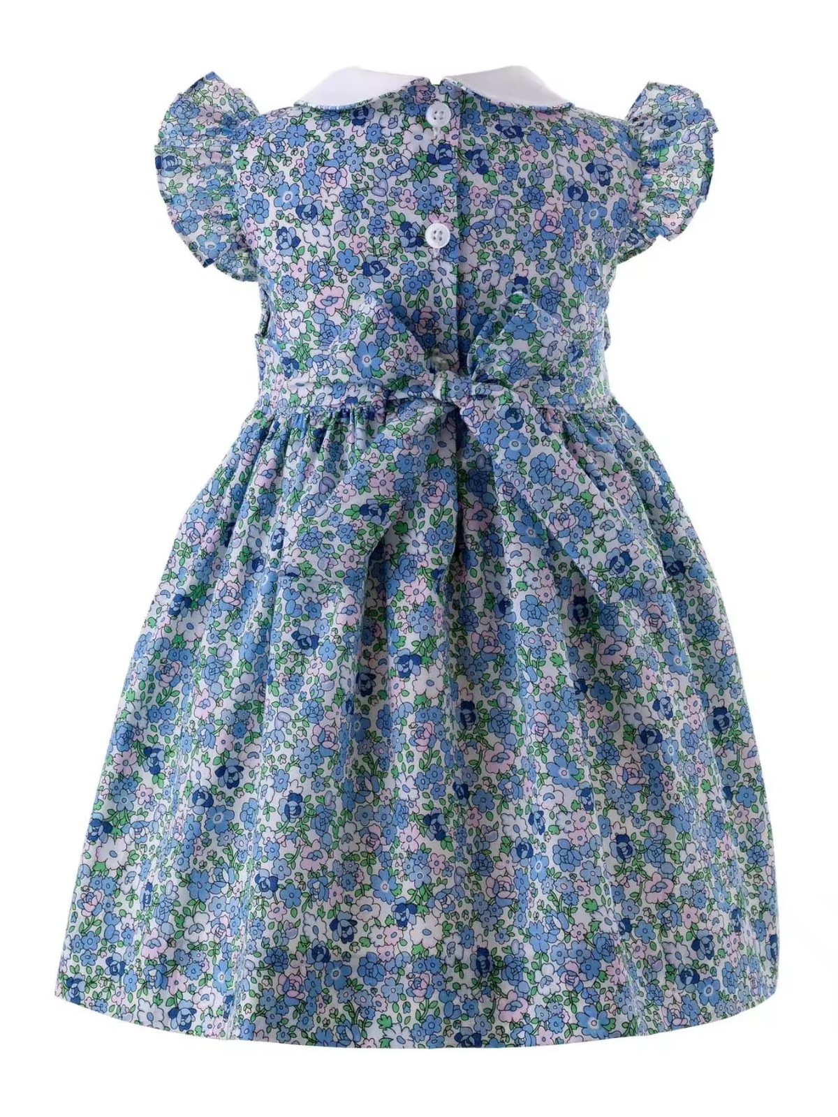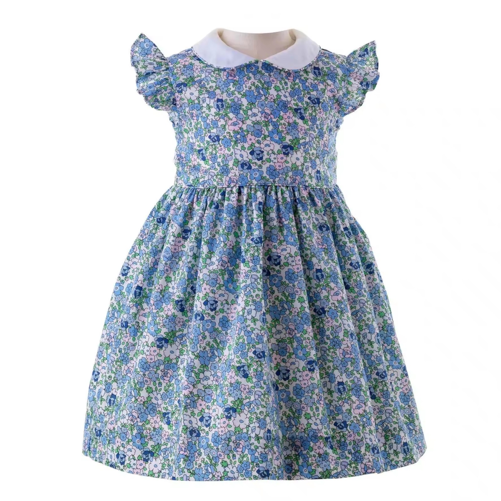 Guangzhou New Designs Blue Floral Cotton Baby Girl Birthday Dresses Summer Fly Sleeve Peter Pan Collar Dress for Girl 2-10 Year