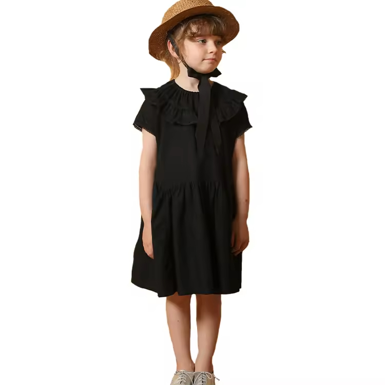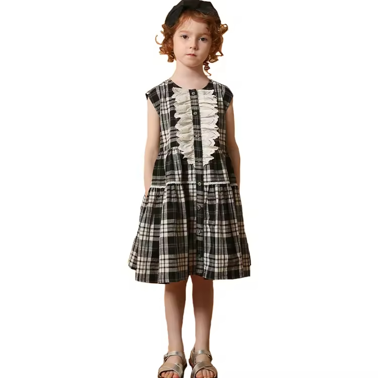 Best Selling High End Design Kid Summer Clothes Girls Dress 2025 Custom Elegant Black Color and Plaid Ruffles Baby Girl Dresses